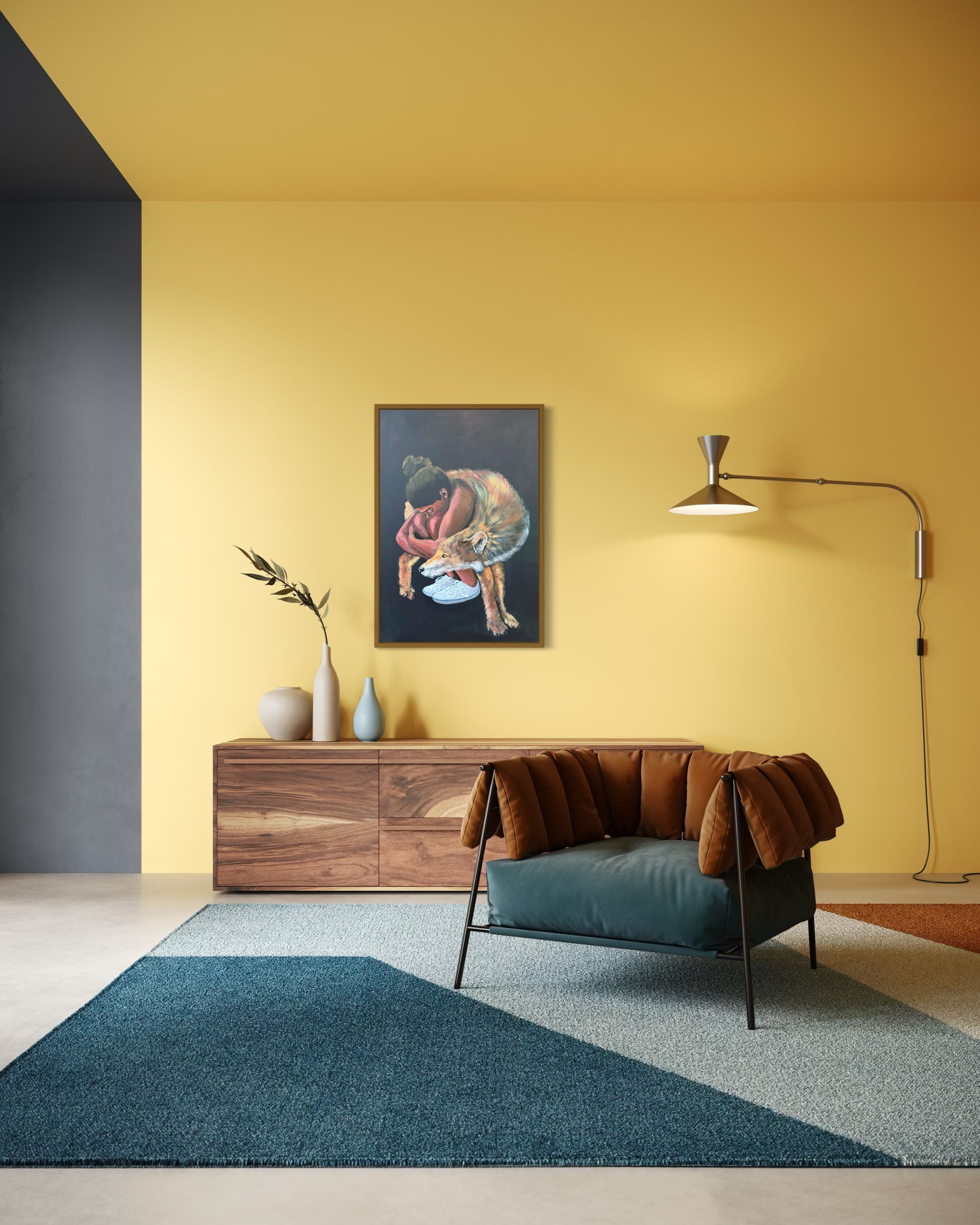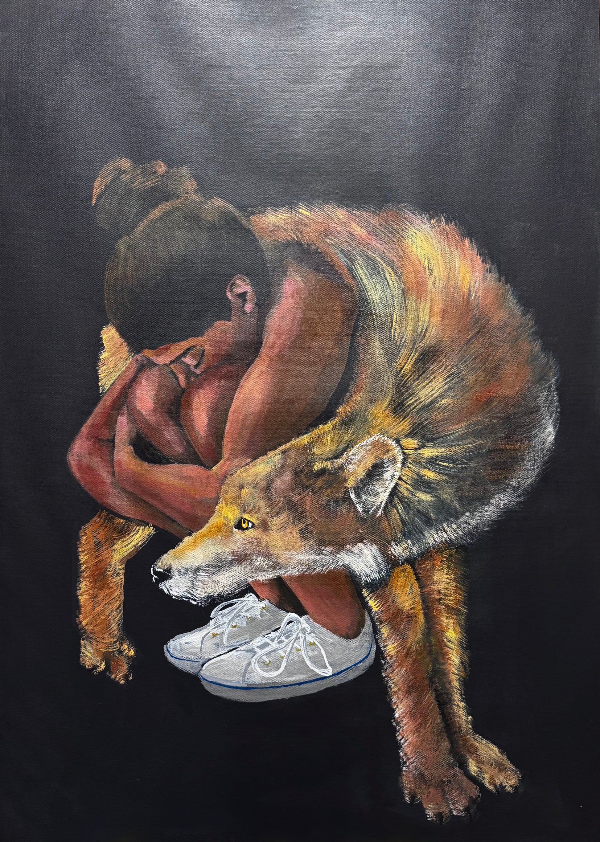 The overall mood of the painting is somber and introspective and invites the viewer to contemplate the image of vulnerability in a modern context.