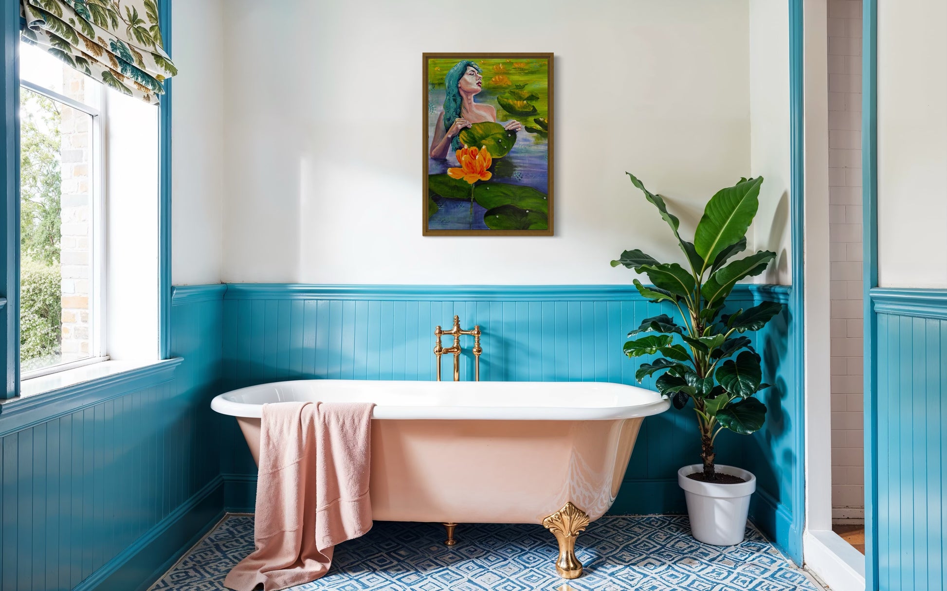 This painting tells a story of connection and harmony between the human and natural worlds. The nymph, a creature of myth and legend associated with water, is entirely at home amongst the lily pads and flowers. The painting speaks to the beauty and fragility of both nature and human existence.