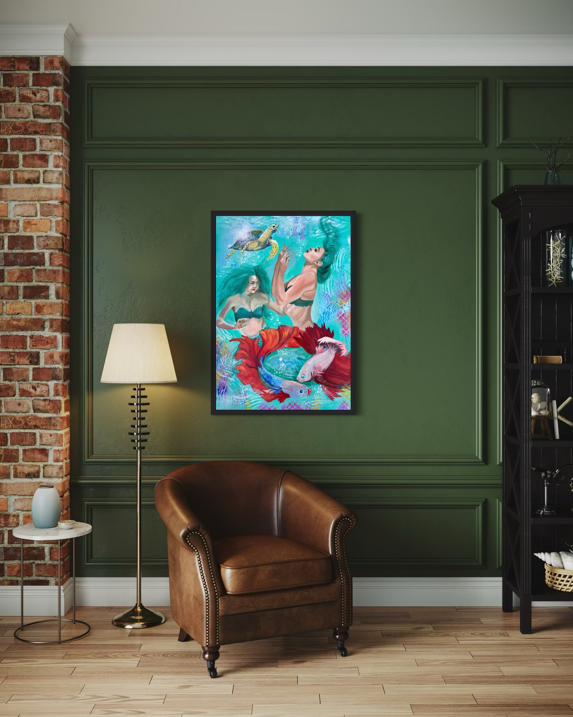 The cool blue tones of the water, combined with the graceful movements of the figures, create a sense of tranquility and serenity. The viewer is invited to explore the depths of their own emotions and intuition, mirroring the siren's journey of self-discovery.