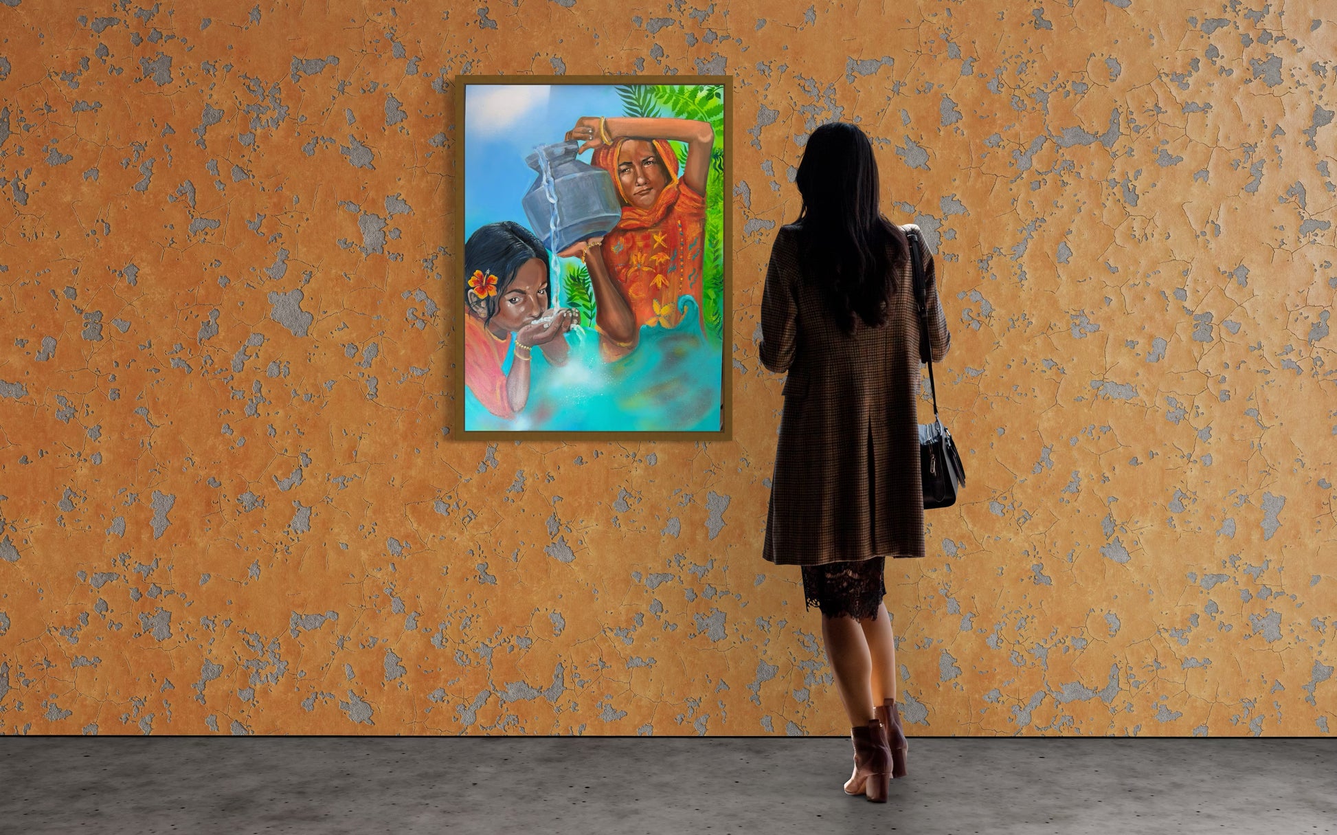 This artwork depicts a poignant scene of water sharing in a region where access to clean water is scarce. The girls' skin tones are rendered with rich warm hues. The older girl, dressed in vibrant orange, carefully pours water from the large water carrier into the cupped hands of the younger girl. The younger girl expresses gratitude and the older girl seems compassionate and responsible beyond her years. The hibiscus flower in the hair of the younger girl adds a touch of delicate beauty.